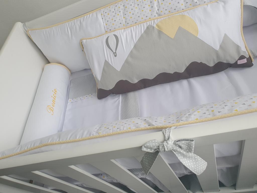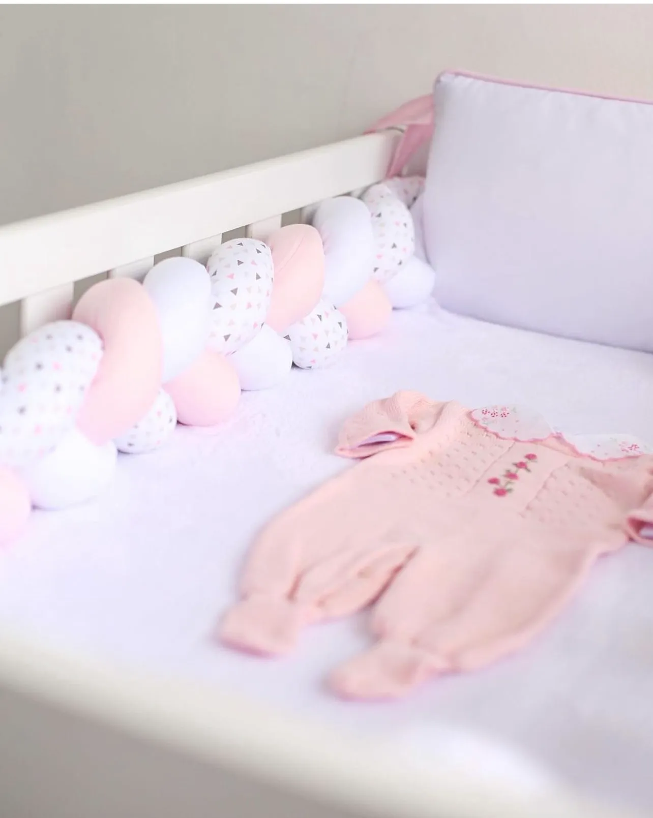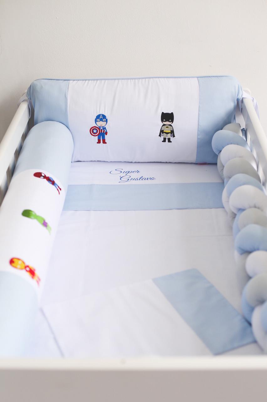 1 Cabeceira + 2 lateral + 1 rolinho de pé + 1 lençol + 1 lençol de elástico + 1 fronha + 1 saia de berço + Uma almofada decorativa da escolha da mãe
