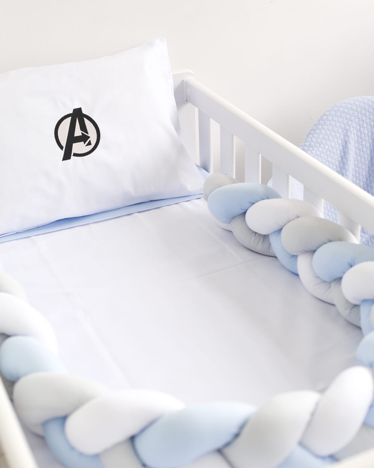 1 Rolinho + 1 cabeceira + 1 trancas + 1 lençol + 1 lençol de elástico + 1 fronha